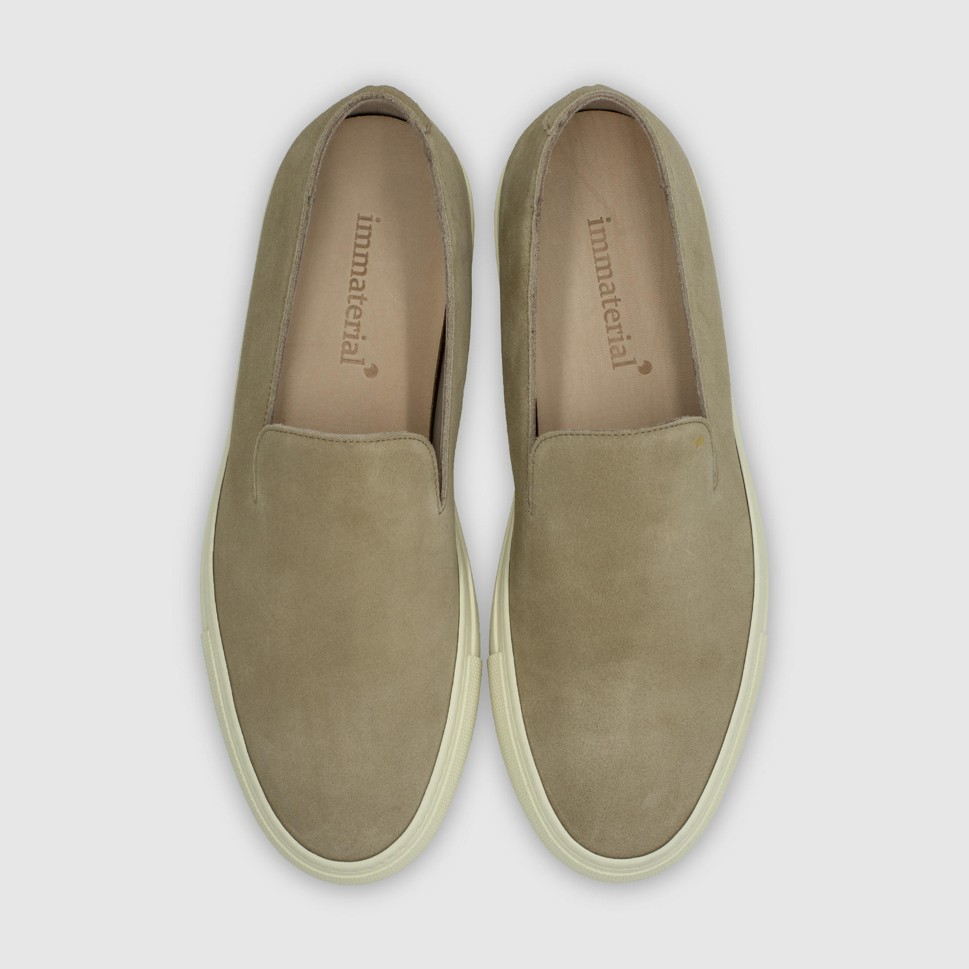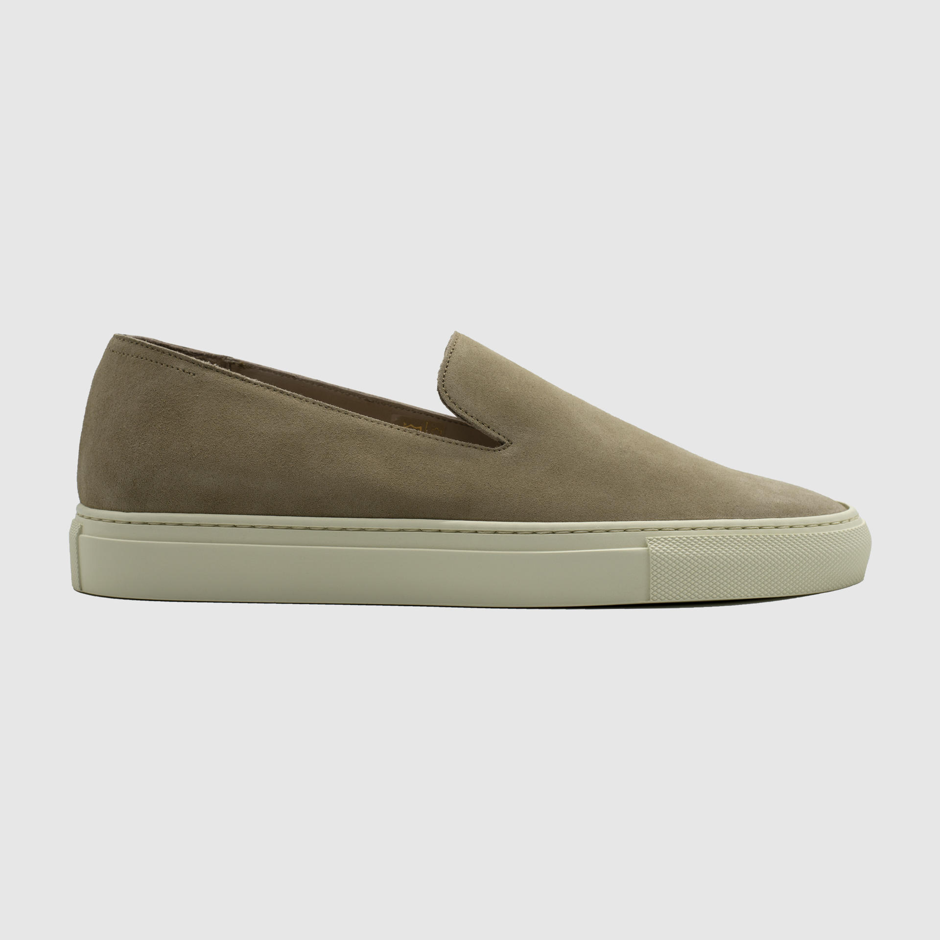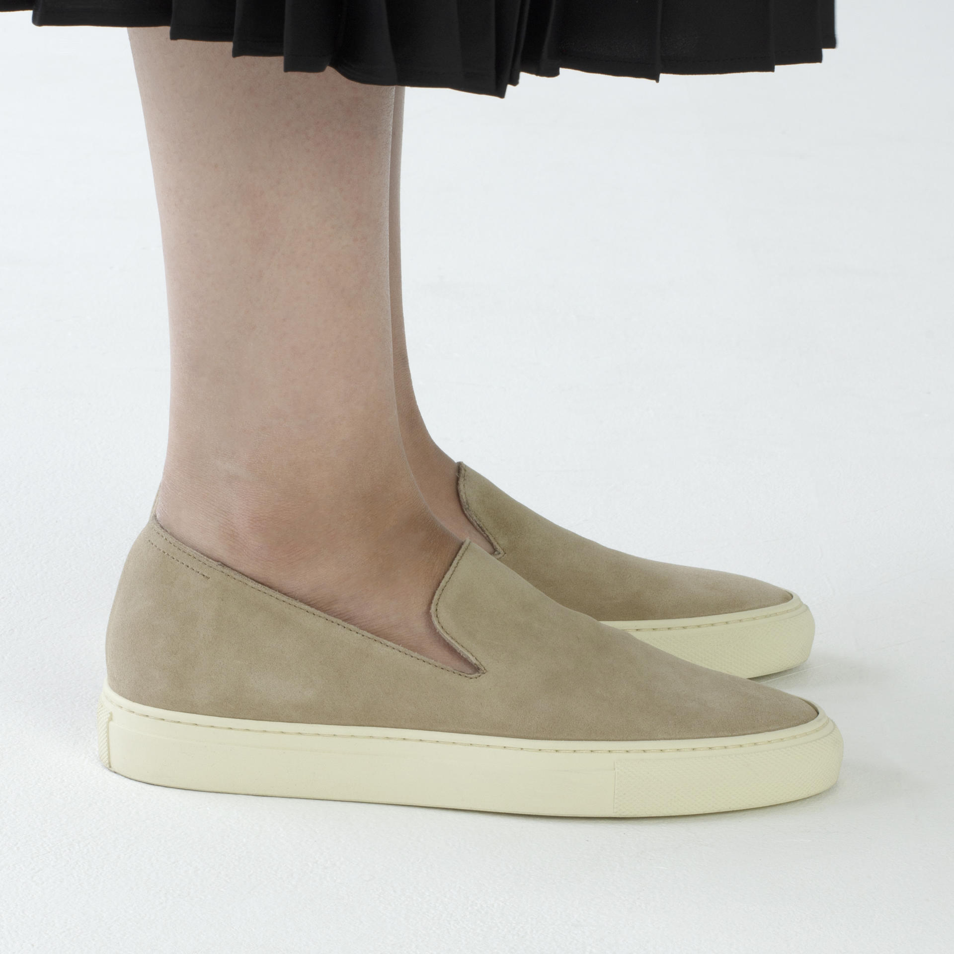Sand-colored calf suede slip-ons, crafted for a refined yet effortless look.