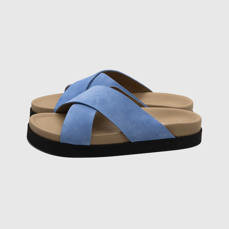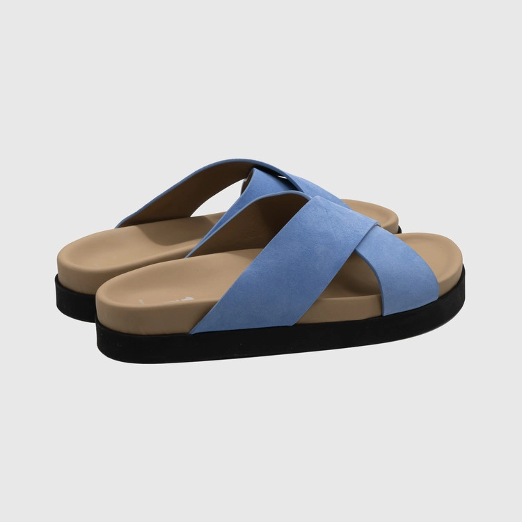 Aqua blue calf suede leather slippers, crafted for a refined yet comfortable look.