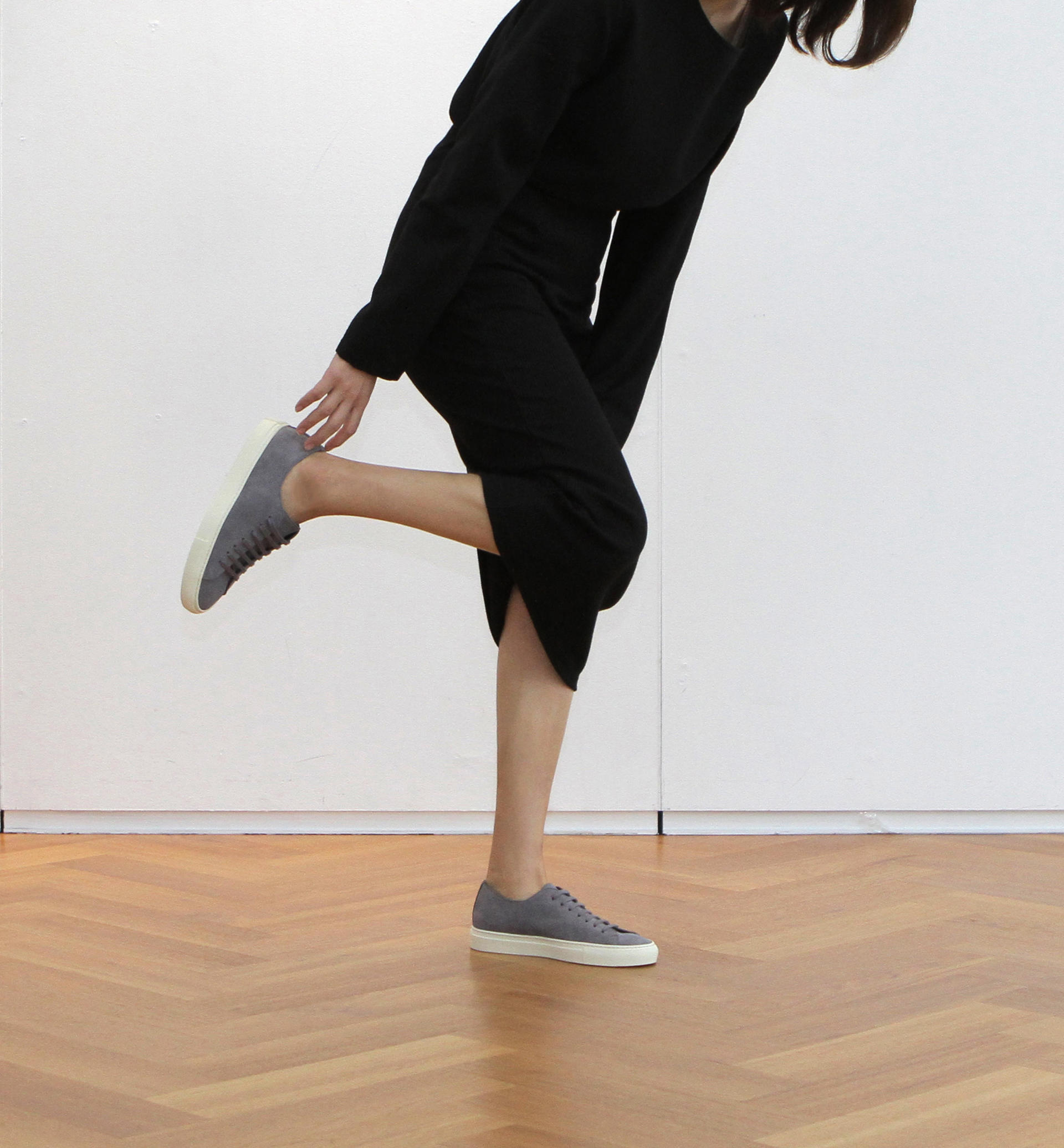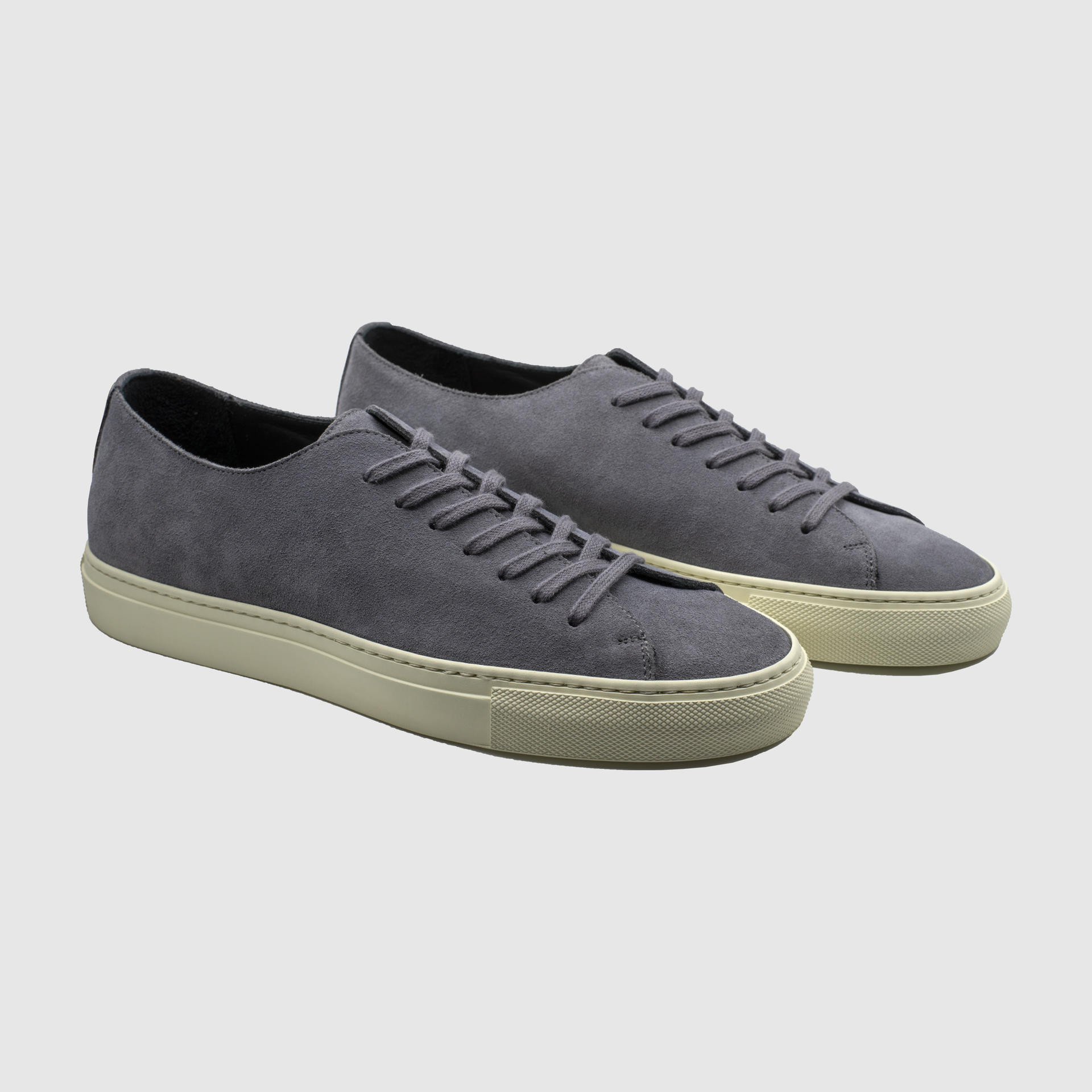 Low-top calf suede sneakers in stone grey. Round toe. Lace-up closure. Classic seven lace holes. Signature moon stamped on the hidden area of the shoe tongue. Stitch reinforced rubber sole. Suede and calf leather lining. Tonal stitching. Heel 3cm.